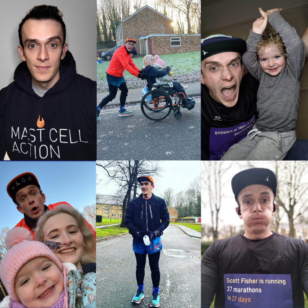 The idea. 'Marathons for MAST Cell originally started when I was making up my wife’s medication for the week. As I put 175 tablets into boxes for a week, I thought. This isn’t good enough; someone needs to do something to help people who are going through this. I started researching challenges and the first one I stumbled across was Eddie Izzards 27 marathons for sports relief. “27 marathons; 27 tablets; we might have something here” I thought.' Read more about Scott’s fundraiser here.