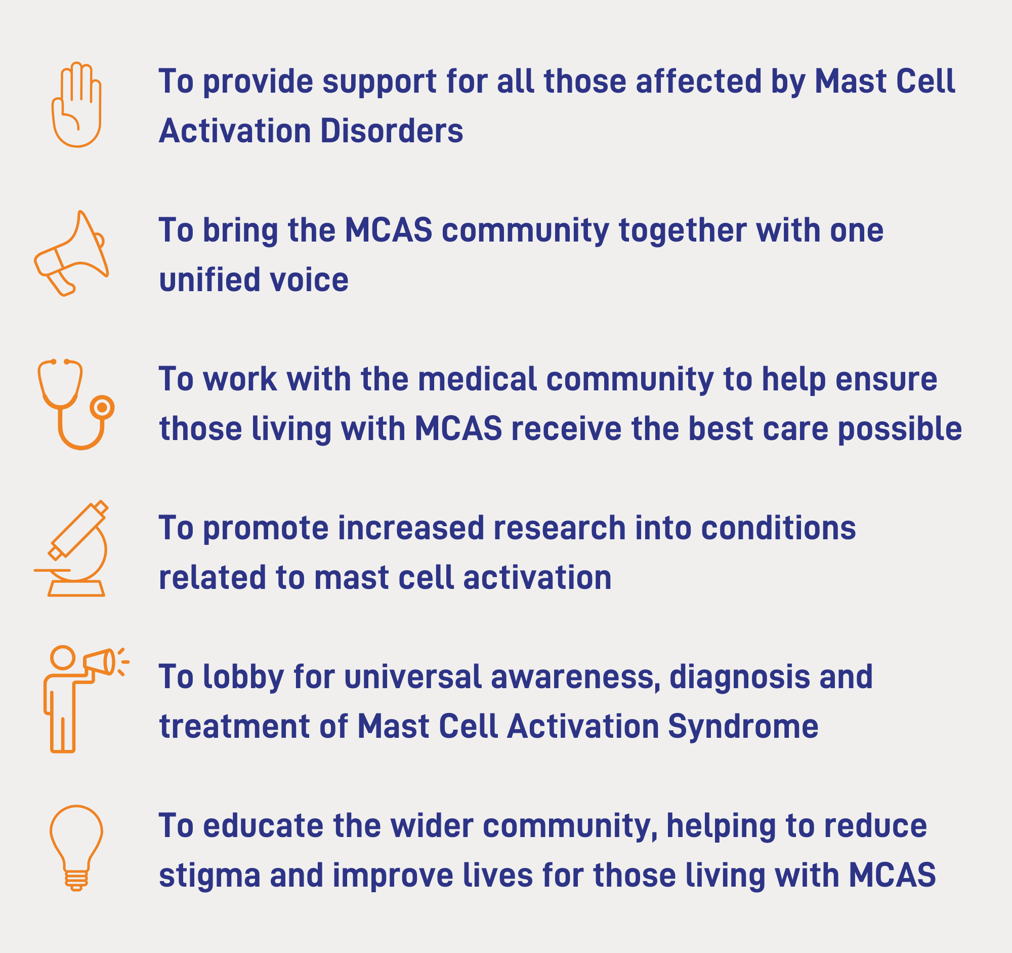 Our mission is to transform the lives of people affected by Mast Cell Activation Syndrome through better healthcare, medical breakthroughs, and a stronger, supported community.